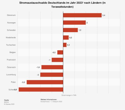 Milliarden kWh (TWh) mehr Strom aus Dänemark, als es nach Dänemark exportierte. Nach Belgien hingegen exportierte Deutschland mehr Strom, also es vom genannten Land importierte. Die negativen Werte in der Statistik geben demnach den Exportüberschuss und die positiven den Importüberschuss an.