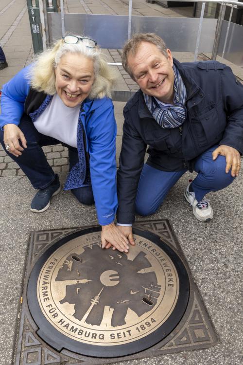 Einen besonderen Schachtdeckel mit Jubiläumsprägung haben die Hamburger Energiewerke im Rahmen ihres 130-jährigen Fernwärme-Jubiläums in der Poststraße nahe dem Rathaus installiert. Bei der Zeremonie waren Umweltsenator Jens Kerstan (Grüne) und Kirsten Fust, technische Geschäftsführerin der Hamburger Energiewerke, dabei (siehe Bild). Der 132