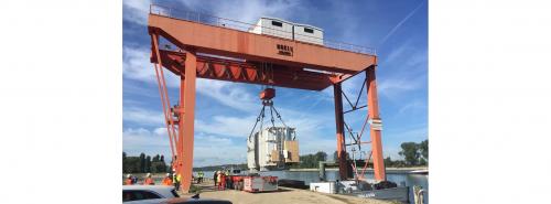 In diesen Tagen sind die beiden letzten von insgesamt vier Transformatoren auf der Kraftwerkbaustelle in Biblis angekommen. Die Anlieferung erfolgte wegen der Höhe von fünf Metern und einem Gewicht von rund 160 Tonnen über den Rhein.