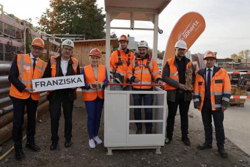 Hertz zurzeit gegraben wird. Die Regierende Bürgermeisterin von Berlin, Franziska Giffey (2. von links), ist Patin des Tunnels und gibt dafür ihren wohlklingenden Vornamen her. In den kommenden zwei Jahren soll eine rund 6,7