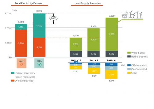 % gegenüber dem heutigen Bedarf steigen. Im "MOL-Pfad" wird davon ausgegangen, dass die Endnachfrage nach Strom in Europa im Jahr 2050 aufgrund eines höheren Anteils erneuerbar erzeugter Moleküle am Endenergieverbrauch nur um 30