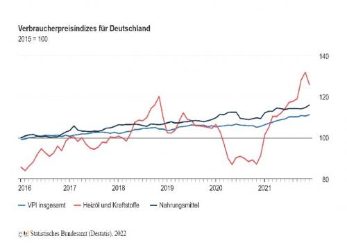 Angeheizt wurde die Teuerung vor allem von rasant gestiegenen Energiepreisen im Zuge der weltweiten Konjunkturerholung nach der Corona-Krise 2020. Energieprodukte verteuerten sich gegenüber dem Vorjahr im Schnitt um 10,4 %, nach einem Rückgang um 4,8 % im Jahr 2020. Die Spitze hielten Heizöl, das 41,8 % teurer wurde und Kraftstoffe, die 22,6 % zulegten. „Hinzu kamen die Rücknahme der vorübergehenden Mehrwertsteuersenkung sowie die Einführung der CO2-Abgabe Anfang 2021 von 25 Euro je Tonne Kohlendioxid für fossile Brennstoffe“, sagte Georg Thiel, Präsident des Statistischen Bundesamtes.