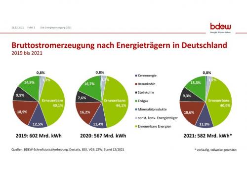 Im Stromerzeugungsmix bleibe die Windenergie trotz eines schwachen Windjahrs mit einer Stromerzeugung von insgesamt 117,3 Mrd. kWh mit Abstand der wichtigste Energieträger im deutschen Strommix. Die geringere Stromerzeugung aus Windenergie und der gleichzeitig gestiegene Strombedarf führten dazu, dass 2021 mehr Strom aus nicht-erneuerbaren Energieträgern produziert wurde. Der wirtschaftliche Aufschwung habe auch die Stromnachfrage und -erzeugung erhöht. So ist die Stromerzeugung von 566,7 Mrd. kWh in 2020 auf 582,2 Mrd. kWh in 2021 gestiegen.