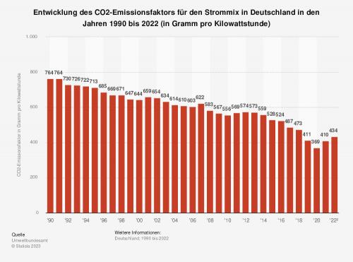 Im Jahr 2022 wurde der CO2-Emissionsfaktor für den Strommix in Deutschland laut Umweltbundesamt auf 434