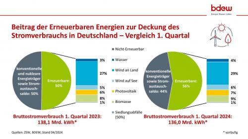 Erneuerbare Energien deckten im ersten Quartal 2024 rund 56 Prozent des Stromverbrauchs in Deutschland ab. Die Ökostromanlagen erzeugten insgesamt etwa 75,9 Milliarden kWh Strom, was einer Steigerung um etwa 9