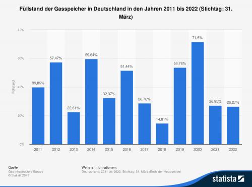 Am 31. März 2022 waren die Gasspeicher in Deutschland zu rund 26 Prozent gefüllt. Die Vorjahreswerte beziehen sich ebenfalls jeweils auf das Ende der Heizperiode zum Stichtag 31. März. Demnach war die Füllmenge 2022 vergleichbar niedrig wie im vergangenen Jahr. Besonders kalte Winter führen zu einer hohen Gasnachfrage. Die Kapazitäten der Gaspipelines reichen dafür nicht aus, sodass auf die Speicher im Inland zurückgegriffen werden muss.
