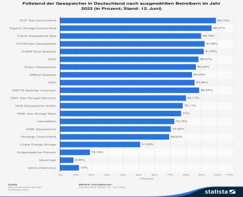 Auch die Astora-Speicher in Deutschland füllen sich jetzt langsam aber sicher: Waren sie Mitte Mai nur zu 4,2 % gefüllt, sind es aktuell 12 %. Astora (Germany) betreibt in Rehden den größten Gasspeicher der Bundesrepublik sowie einen kleineren im niedersächsischen Jemgum.