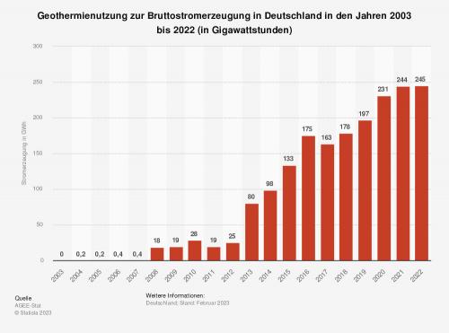 Die Statistik zeigt die Entwicklung der Bruttostromerzeugung aus Geothermie in Deutschland in den Jahren 2003 bis 2022. Im Jahr 2022 wurden in Deutschland rund 245 Gigawattstunden Strom aus Geothermieanlagen erzeugt.