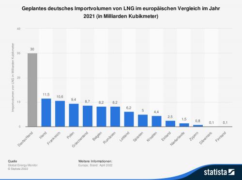 LNG – flüssiges Erdgas – rückte bereits vor dem Krieg in der Ukraine in den europäischen Fokus der Energieversorgung. Anhand der Statistik wird deutlich, dass im Jahr 2021 Deutschland vergleichsweise ambitionierte Ziele hinsichtlich des Ausbaus der LNG-Infrastruktur verfolgte. Hierbei gilt es gleichzeitig zu betonen, dass Deutschland bisher (Stand: Mai 2022) über keine LNG-Terminals für den Import des Flüssigerdgases verfügt und dass die Zahlen ausschließlich geplante Importkapazitäten berücksichtigt. Da Länder wie Frankreich, Spanien oder die Niederlande längst über eine ausgebaute LNG-Infrastruktur verfügen, müssen ihre dargestellten Werte kontextualisiert betrachtet werden.