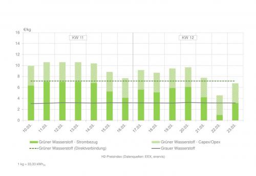 | H2-Preisindex für die Kalenderwochen 11 und 12 (zur Vollansicht bitte auf die Grafik klicken) Quelle: enervis energy advisors GmbH / EEX |