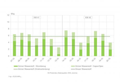 | Wasserstoffpreisindex in den Kalenderwochen 41 und 42. Zur Vollansicht bitte auf die Grafik klicken Quelle: enervis energy advisors GmbH / EEX |