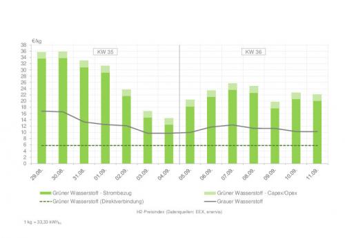 Wasserstoffpreisindex in den Kalenderwochen 35 und 36 Quelle: enervis energy advisors GmbH / EEX |