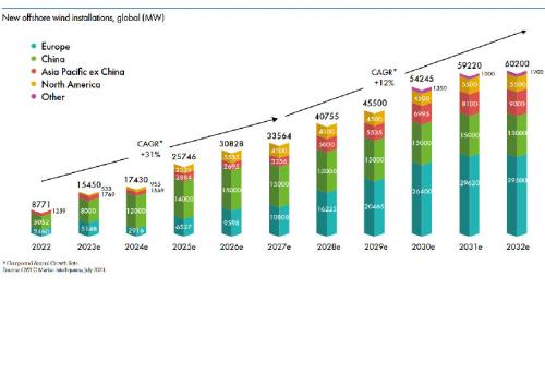 Das liege für Europa an Verzögerungen aufgrund langsamer Genehmigungen und Engpässen in den Lieferketten und bei den Schiffen und Häfen. Andererseits mache die längerfristige Prognose Hoffnung auf ein starkes Wachstum von bis zu 25.000 MW Windkraft Offshore jährlich für die Zeit von 2028 bis 2032. Backwell sagte: „Der Offshore-Windsektor hat ein weiteres Jahr mit beeindruckendem Wachstum geliefert und das Potenzial für ein Rekordwachstum von nun an jedes Jahr“. Dies würde zu einem transformierten, sauberen und sicheren Energiesystem führen – insbesondere im asiatisch-pazifischen Raum.