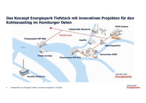 Mit der Fertigstellung des Energieparks Tiefstack sänken die CO2-Emissionen der zentralen Hamburger Stadtwärmeversorgung gegenüber heute um 70 bis 80 %. Der Kohleausstieg werde bis spätestens 2030 umgesetzt. Damit leisteten die Hamburger Energiewerke den größten Einzelbeitrag zum Erreichen der Klimaziele des Stadtstaates. Die Flusswärmepumpen könnten mit zusammen rund 230 MW Leistung 130.000 Haushalte mit grüner Wärme versorgen und wären derzeit die größten in Deutschland geplanten Anlagen.