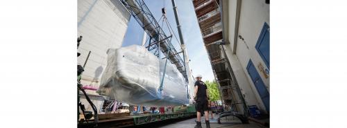Anlieferung und Einbau der ersten Flusswasser-Großwärmepumpe im Heizkraftwerk Schöneweide. Sie ist Teil des iKWK-Systems Quelle: BTB Berlin/Leon Kopplow |