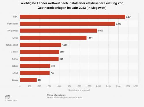 Die Statistik zeigt die wichtigsten Länder weltweit nach installierter Leistung von Geothermieanlagen im Jahr 2023 nach Zahlen der Irena. Im genannten Jahr betrug die installierte elektrische Leistung der Geothermieanlagen auf Island rund 756