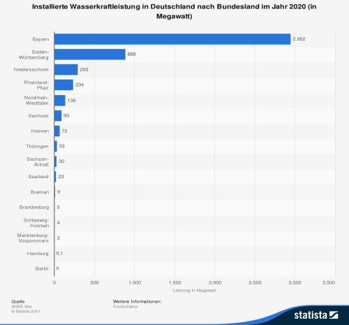 Die Statistik zeigt die installierte Wasserkraftleistung in Deutschland nach Bundesland. Im Jahr 2020 betrug die installierte Leistung aller Wasserkraftwerke im insoweit führenden Freistaat Bayern rund 2.950 MW.