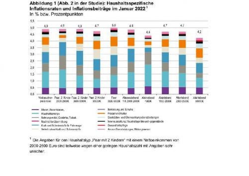 Die Inflationsanalyse des IMK sieht kinderlose Paare mit mittlerem Einkommen aktuell am höchsten belastet, Singles mit hohem Einkommen am geringsten. Gemessen an den für diese Haushaltstypen repräsentativen Warenkörben seien die Preise im Januar 2022 um 5