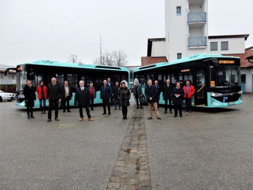 Mitglieder des Verwaltungsrates der Stadtwerke Weilheim und einige Mitarbeiter vor zwei elektrischen Bussen Quelle: SW Weilheim |