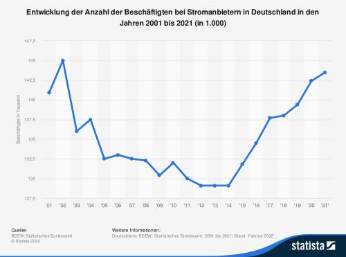 Die Statistik zeigt die Entwicklung der Beschäftigtenzahl bei Stromanbietern in Deutschland. Im Jahr 2021 waren rund 143.500 Personen bei deutschen Stromanbietern beschäftigt. Die Zahlen basieren auf Angaben vom Bundesverband der Energie- und Wasserwirtschaft (BDEW und des Statistischen Bundesamtes.