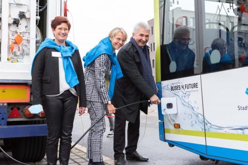 NRW-Wirtschaftsminister Andreas Pinkwart, die Präsidentin der Bezirksregierung Münster, Dorothee Feller (Mitte), und Westfalen-Vorständin Meike Schäffler bei der Tankvorführung an der mobilen Wasserstoff-Tankstelle Quelle: Westfalen AG |