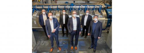 Vor einem der zehn Motoren des BHKW: Vordere Reihe von links: Michael Ebling, Oberbürgermeister der Stadt Mainz, Oliver Malerius, KMW-Vorstandsvorsitzender, Gert-Uwe Mende, Oberbürgermeister der Stadt Wiesbaden Zweite Reihe von links: Jörg Höhler, Stephan Krome, beide Vorstand KMW, Thomas Scherer, Betriebsratsvorsitzender KMW Bild: KMW |