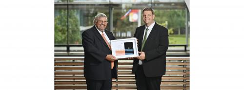 Norbert Krug (links) ist erstes Ehrenmitglied des Verbandes für Energiedienstleistungen, Effizienz und Contracting (Vedec), hier mit Urkunde aus der Hand des jetzigen Vorstandsvorsitzenden Tobias Dworschak Quelle: Vedec/Michael Wendt |