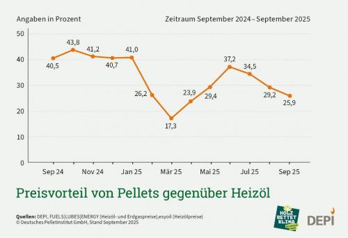 Umgerechnet zahlen Nutzer aktuell 6,70 Cent pro kWh Wärme. Gegenüber dem Vormonat bedeutet dies ein Plus von rund 7,8 Prozent. Doch sind Holzpellets immer noch um einiges billiger als Heizöl „Der Preisvorteil gegenüber Heizöl liegt bei rund 26 Prozent“, so das Depi.