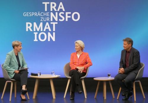Beim ersten "Gespräch zur Transformation" am 29. August 2022 (von links): Moderatorin Anne Gellinek, EU-Kommissionspräsidentin Ursula von der Leyen, Bundeswirtschaftsminister Robert Habeck. Quelle: BMWK |