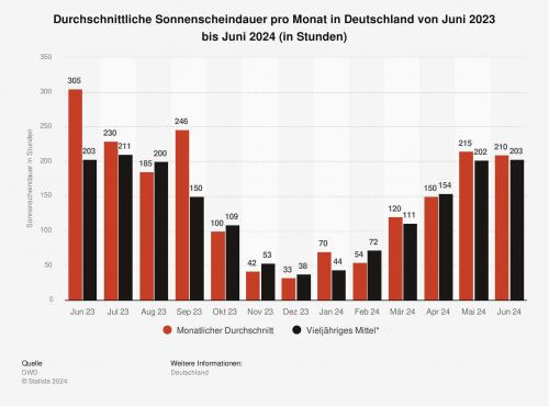 Im Juni 2024 wurden durchschnittlich 210 Sonnenstunden gemessen. Das vieljährige Mittel in Höhe von 203 Sonnenstunden wurde somit knapp übertroffen. Im Jahr 2023 schien die Sonne im Durchschnitt hierzulande rund 1.764 Stunden. Die sonnenscheinreichsten Bundesländer waren Baden-Württemberg, Bayern und das Saarland. Am wenigsten zeigte sich die Sonne im angegeben Jahr in Niedersachsen.