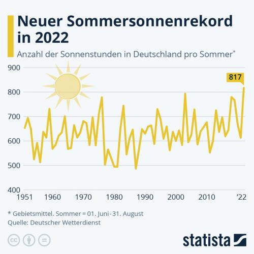 Der Deutsche Wetterdienst (DWD) hat ein vorläufiges Ergebnis für die Anzahl der Sonnenstunden im meteorologischen Sommer 2022 veröffentlicht. Mit 817 Stunden im deutschlandweiten Mittel liegt selbiges deutlich über dem bisherigen Rekord von 793 Stunden aus dem Jahr 2003. Wie die Grafik weiter zeigt, kam bis auf wenige Ausreißer seit 1951 kein Jahr auch nur annähernd an die 800-Stunden-Marke heran.