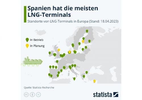 Bundeskanzler Olaf Scholz (SPD) hat als Reaktion auf den Ukraine-Krieg und die Abhängigkeit von russischem Erdgas den Aus- und Neubau von Terminals für Flüssigerdgas (LNG) in Deutschland angekündigt. Zuvor hatte bereits Bundeswirtschaftsminister Robert Habeck (Grüne) angekündigt, den Import von Flüssiggas nach Deutschland erhöhen zu wollen und dafür den Bau von Terminals für Flüssiggas an der deutschen Küste zu fördern. Bislang sind Terminals in Brunsbüttel, Wilhelmshaven und Lubmin im Einsatz, zwei weitere sind in Stade und auf Rügen geplant. Deutschland hat Aufholbedarf: Die meisten LNG-Terminals gibt es in Spanien, wie die Infografik von Statista zeigt. Neben Deutschland planen auch Zypern, Finnland und das Vereinigte Königreich weitere Terminals