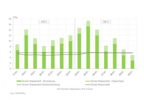 Der „H2-Preisindex“ als neues gemeinsames Informationsangebot des Berliner Beratungshauses „enervis energy advisors GmbH“ (Enervis) und E&M möchte diese Preise transparent machen. Herangezogen wird ein kostenbasierter Referenzpreis, der die aktuellen Gestehungskosten von grünem und grauem Wasserstoff in Deutschland einander gegenüberstellt. Der Index basiert auf den Preisen am Spotmarkt für Strom, Erdgas und CO2-Zertifikate. Steuern, Entgelte und Umlagen werden nicht berücksichtigt. Der H2-Preisindex wird alle zwei Wochen veröffentlicht.