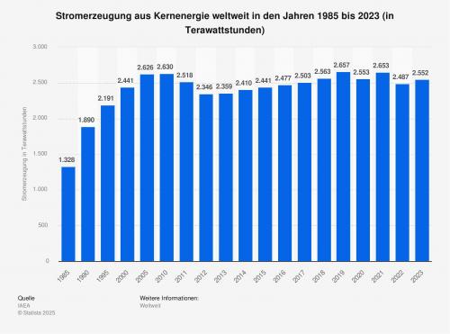 Die Statistik zeigt die weltweite Stromerzeugung aus Kernenergie in den Jahren 1985 bis 2023. Im Jahr 2023 wurden weltweit insgesamt rund 2.552 Terawattstunden Strom aus Kernenergie erzeugt.