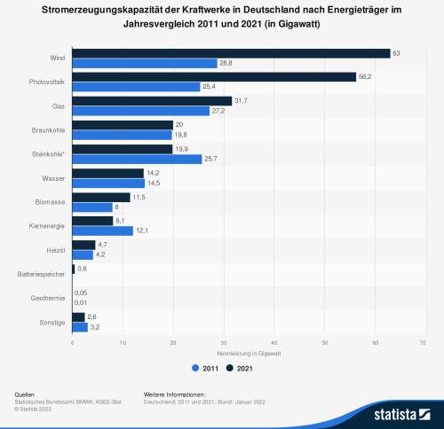 Die Statistik zeigt die Stromerzeugungskapazität der Kraftwerke in Deutschland nach Energieträger im Jahresvergleich 2011 und 2021. Im Jahr 2021 betrug die Nennleistung der Braunkohlekraftwerke zur Stromerzeugung in Deutschland rund 20 Gigawatt.
