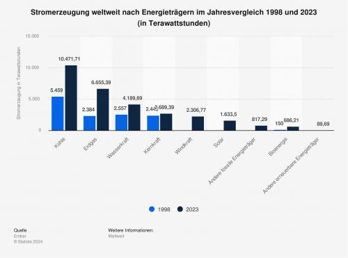 Die Statistik zeigt die globale Stromerzeugung nach Energieträgern im Jahresvergleich 1998 und 2023 nach Zahlen von Ember. Im Jahr 2023 wurden weltweit rund 4,2 Petawattstunden Strom aus Wasserkraft erzeugt. Wasserkraft ist mit Abstand die wichtigste erneuerbare Energiequelle. Über 50