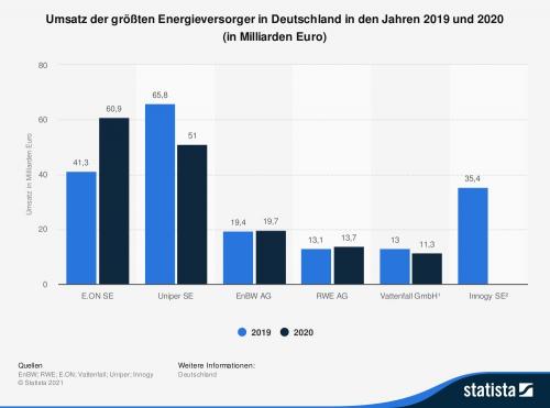 Im Jahr 2020 war Eon mit einem Umsatz von 60,9 Mrd. Euro auf Rang eins der größten Energieversorger Deutschlands. Auf Rang zwei folgte Uniper. Nach der Strom-Absatzmenge liegt Uniper vorne, gefolgt von Eon und RWE.