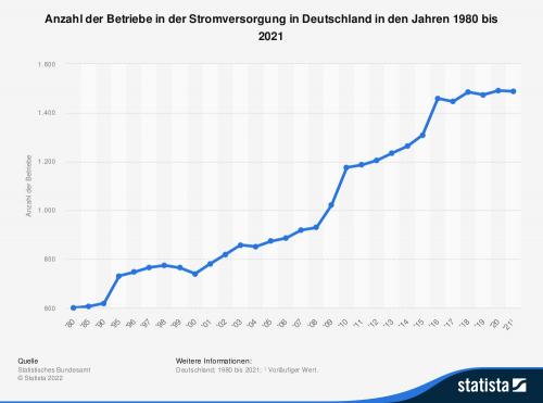 Die Statistik zeigt auf Basis von Zahlen des Statistischen Bundesamtes die Anzahl der Unternehmen, die in Deutschland im Bereich Stromversorgung tätig sind. Im Jahr 2021 wurden in der Bundesrepublik 1.488 gezählt.