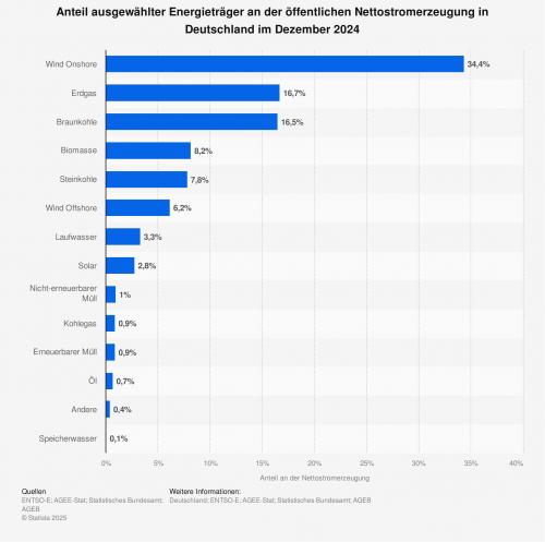 Im Dezember 2024 betrug der Anteil der Onshore-Windkraftanlagen an der deutschen Nettostromerzeugung rund 34