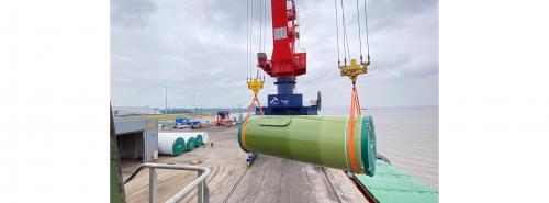 Häfen sind auch für die Onshore-Windbranche wichtig − hier der Umschlag eines Windturmsegments in Brunsbüttel Quelle: Schramm Ports and Logistics |