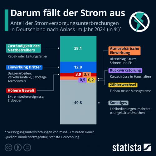 Stromausfälle können in Deutschland viele Ursachen haben. Neben der großen Gruppe der sonstigen Anlässen, zu denen etwa Fehlbedienungen der Strominfrastruktur oder ungeklärte Ursachen zählen, sind nach Angaben der Bundesnetzagentur Ausfälle sehr häufig, die in den Zuständigkeitsbereich der Netzbetreiber fallen. Hierzu zählen Kabel- oder Leitungsfehler. Danach folgen so genannte Einwirkungen Dritter. Dies können Baggerarbeiten und Verkehrsunfälle sein oder aber auch Sabotageakte und terroristische Anschläge. Der derzeitige großflächige Stromausfall in Berlin zählt etwa hierzu. Vergleichsweise selten sind dagegen Höhere Gewalt (Extremwettereignisse, Erdbeben), atmosphärische Einwirkungen (Blitzschlag, Sturm, Schnee, Eis), Rückwirkungsstörungen durch Kurzschlüsse oder aber Zählerwechsel.
