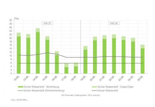Trotz der weiter angespannten Situation im Strom- und Gasmarkt sind die Gestehungskosten für strommarktbasierten grünen Wasserstoff in den vergangenen zwei Wochen wieder gesunken. Das ergibt der H2-Preisindex von Enervis und E&M.