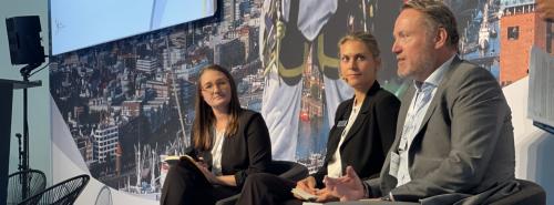 Auf dem Nachhaltigkeits-Podium Lieferkette (von rechts): Simon Bradley (Vattenfall), Melanie Welzel (Nordex) und Erica Inslee (TPI Composites) Quelle: E&M / Georg Eble |