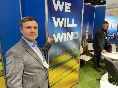 Ungeachtet des Verteidigungskrieges ihres Landes war die Ukrainische Windenergievereinigung (Uwea) bei der Weltleitmesse Wind Energy in Hamburg wieder mit einem Standteam vertreten. Als aktuelle Claims verwendete die Uwea vor den Landesfarben Blau-Gelb Wortspiele wie "We will win(d)" und "Born to win(d), um die doppelte Mission für die Windkraft und für den Sieg im Krieg zu unterstreichen. Im Vordergrund Mykola Gerasimenko, CEO der MCL-Gruppe, einem Kiewer Windpark-Entwickler.