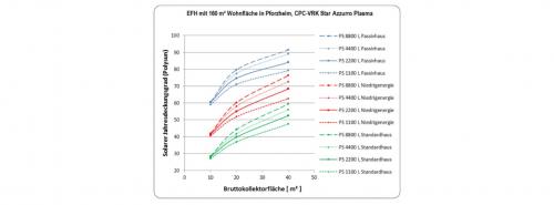 Bereits mit 10 m2 Kollektorfläche und 1 m3 Kombispeicher erreicht das Passivhaus 60 % Solar-DG, das Standardhaus immerhin über 25 %. Hier erzielen größere Speicher keinen Mehrertrag, größere Kollektorflächen jedoch sehr wohl. Der solare DB wächst zunächst viel schneller mit der Kollektorfläche als mit der Speichergröße. Mit 45 m2 wird ein Solar-DG von 50 % auch beim Bestands- oder Standardhaus erreicht – das Passivhaus nähert sich dann schon 90 %.  |
