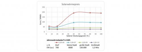 Solarwärmepreis für verschiedene Anlagengrößen und Solardeckung. Zur Vollansicht bitte auf die Grafik klicken Quelle: Rolf Meißner / Ritter XL Solar |