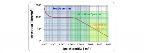 Wählt man am anderen Ende der Skala das Fernwärmenetz einer Großstadt mit einem Bedarf von 10 Mrd. kWh, dann wird Speichern so günstig, dass Stagnation − so heißt das Abschalten der Solaranlage − Verschwendung wäre. Der Wärmepreis ist dann so niedrig, dass es vernünftig erscheint, eine solare Vollversorgung anzustreben. Bei zwei Quadratmeter/MWh ergibt sich ein Wärmepreis von unter 26 Euro/MWh. Mit einer Investition von 6,4 Mrd. Euro hätte diese Großstadt ihre Fernwärme für die nächsten 25 Jahre im Voraus bezahlt, 83 % davon für die Kollektoranlage und 17 % für den Erdbeckenspeicher. Dieser hätte bei 160 Meter Tiefe einen Durchmesser von einem Kilometer. Das klingt zwar gewaltig, aber Kollektorfläche und Speicher zusammen benötigen dann trotzdem mit rund 35 Quadratkilometer