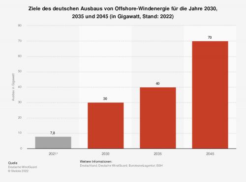 GW. Da der Anteil der erneuerbaren Energien an der Stromversorgung in Zukunft stark ansteigen soll, wurden mit einer Gesetzesnovelle 2022 neue Ausbauziele für die Offshore-Windenergie beschlossen: Im Jahr 2045 sollen nach den neuen Zielen Offshore-Anlagen mindestens 70