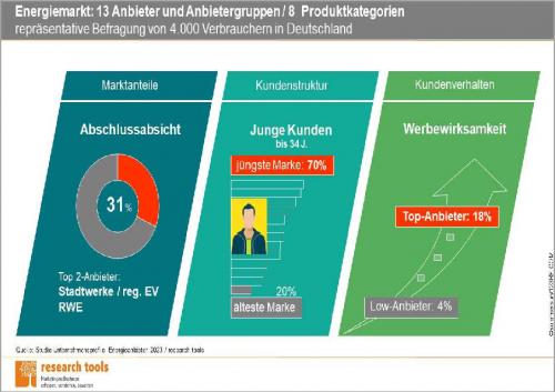 Im abschließenden Vergleich der Kundenprofile über 14 Marketingkennzahlen – von Abschlussabsicht über Kundenloyalität bis Onlineabschluss – liegt die EnBW mit dem besten durchschnittlichen Rang vorne. EWE und Rheinenergie folgen mit ebenfalls überdurchschnittlichem Ergebnis, so Research Tools. Der Marketinganalyst hat seinen Sitz in Esslingen am Neckar.