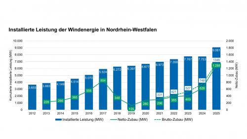 In Nordrhein-Westfalen wurde im Jahr 2025 zum ersten Mal die Marke von 1.000 MW beim Zubau neuer Windkraftanlagen überschritten.